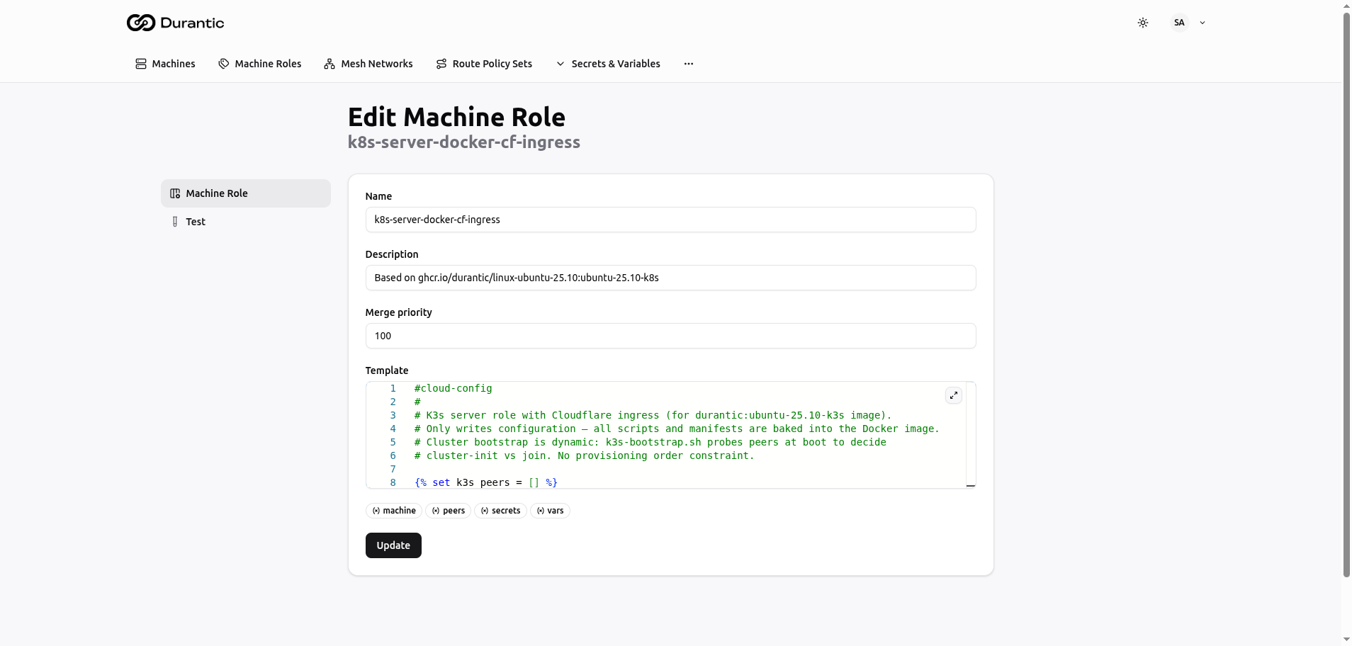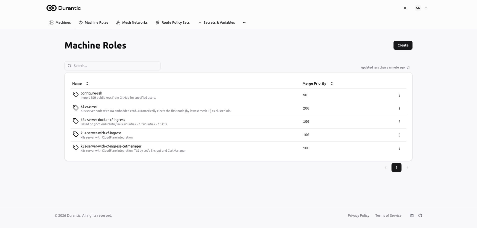 Machine roles are reusable configuration templates that produce cloud-init YAML. A role defines what a machine should look like after provisioning — packages to install, files to write, scripts to run, and services to configure. You can assign one or more roles to each machine, and Durantic merges them into a single cloud-init configuration.