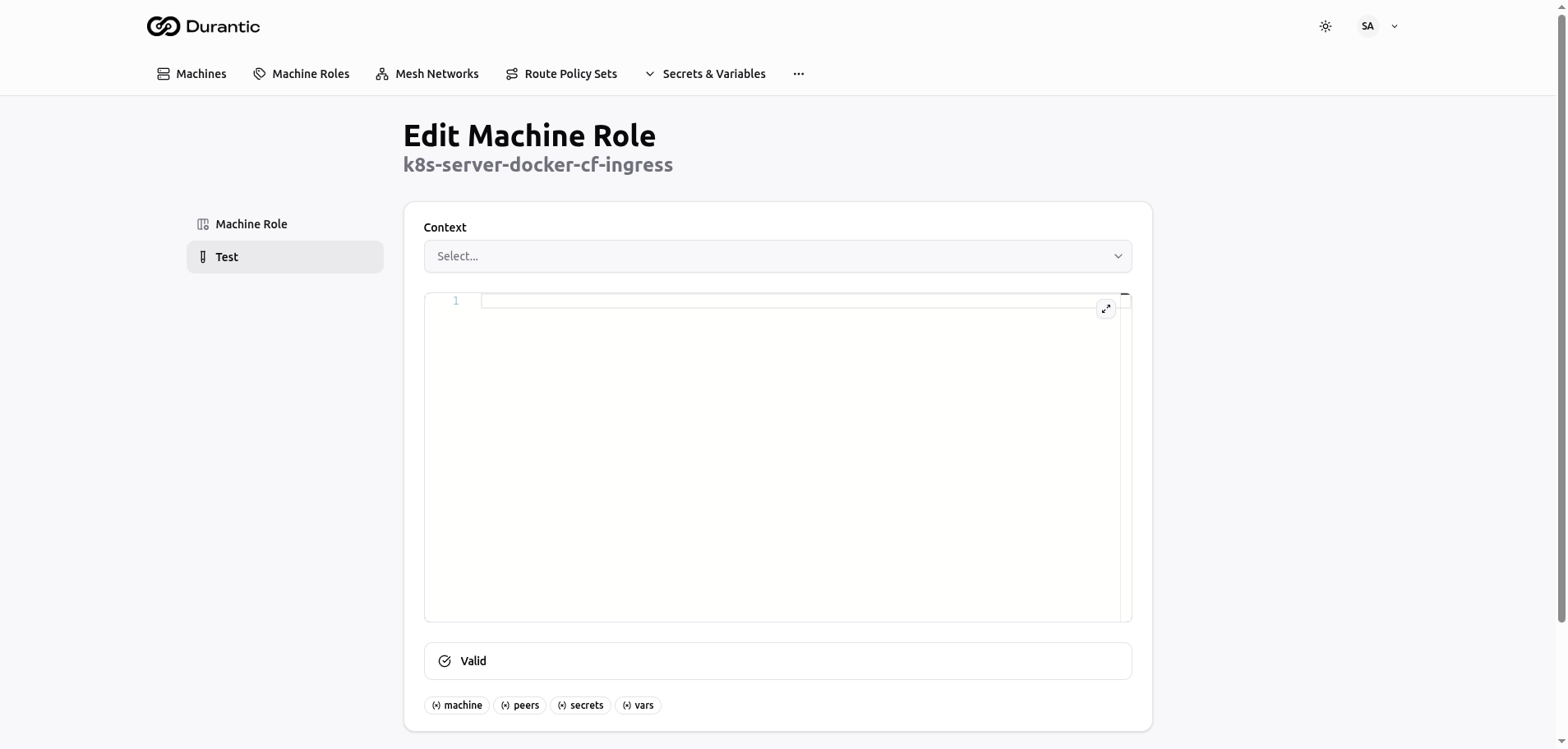 - Context variable badges (machine, peers, secrets, vars) are displayed at the bottom for reference.